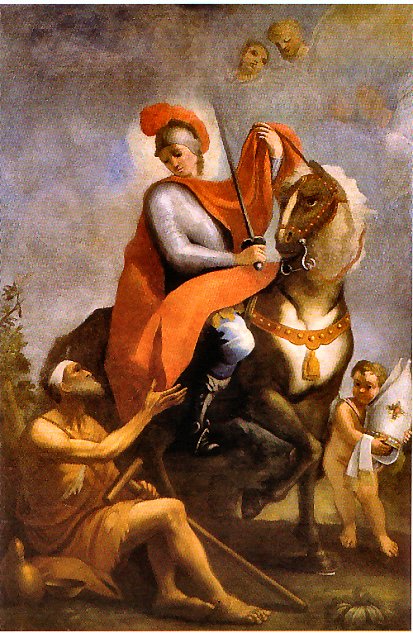 La scelta di dedicare a San Martino di Tours la comunità parrocchiale di Torino è dovuta alla figura del Santo, militare e cavaliere delle Scholae imperiali. Figlio di un legionario romano, nacque a Sabaria in Pannonia (ora Ungheria) ma svolse il suo servizio militare e pastorale in Gallia (attuale Francia). Narra l’agiografia del Santo che nel rigido inverno del 335 incontrò un mendicante seminudo e che, impietositosi, tagliò in due il suo mantello della guardia imperiale, condividendolo col mendicante. – “La notte seguente vide in sogno Gesù rivestito della metà del suo mantello militare. Udì Gesù dire ai suoi angeli: «Ecco qui Martino, il soldato romano che non è battezzato, egli mi ha vestito». Quando Martino si risvegliò il suo mantello era integro” (da Vikipedia) – Il mantello miracoloso entrò nella collezione dei Re di Francia e l’oratorio reale dove si custodiva il suo mantello corto (cappella) prese il nome di Cappella e i sacerdoti che lo custodivano: cappellani.